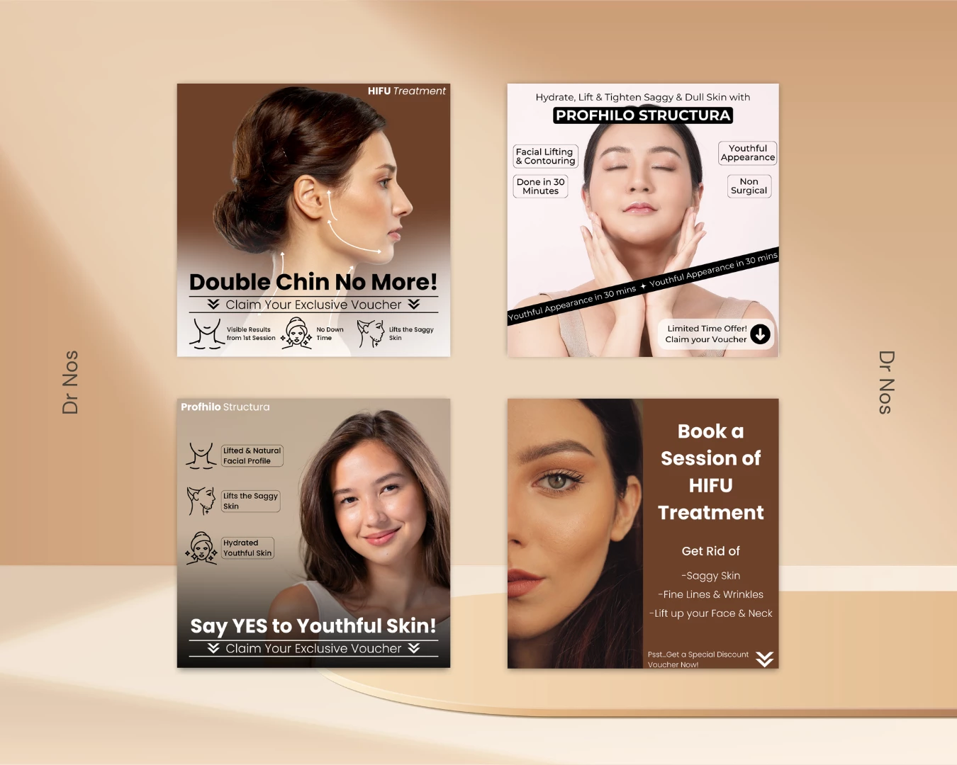 In the execution phase, I employed a combination of graphic design, photography, and copywriting techniques to create compelling content for targeted treatments. Each piece of content was meticulously crafted to communicate key brand messages, showcase their services and offerings, and evoke a response from their audience. I also designed a landing page where the audience can book their appointments directly and pay a deposit for priority treatment & extra discount.